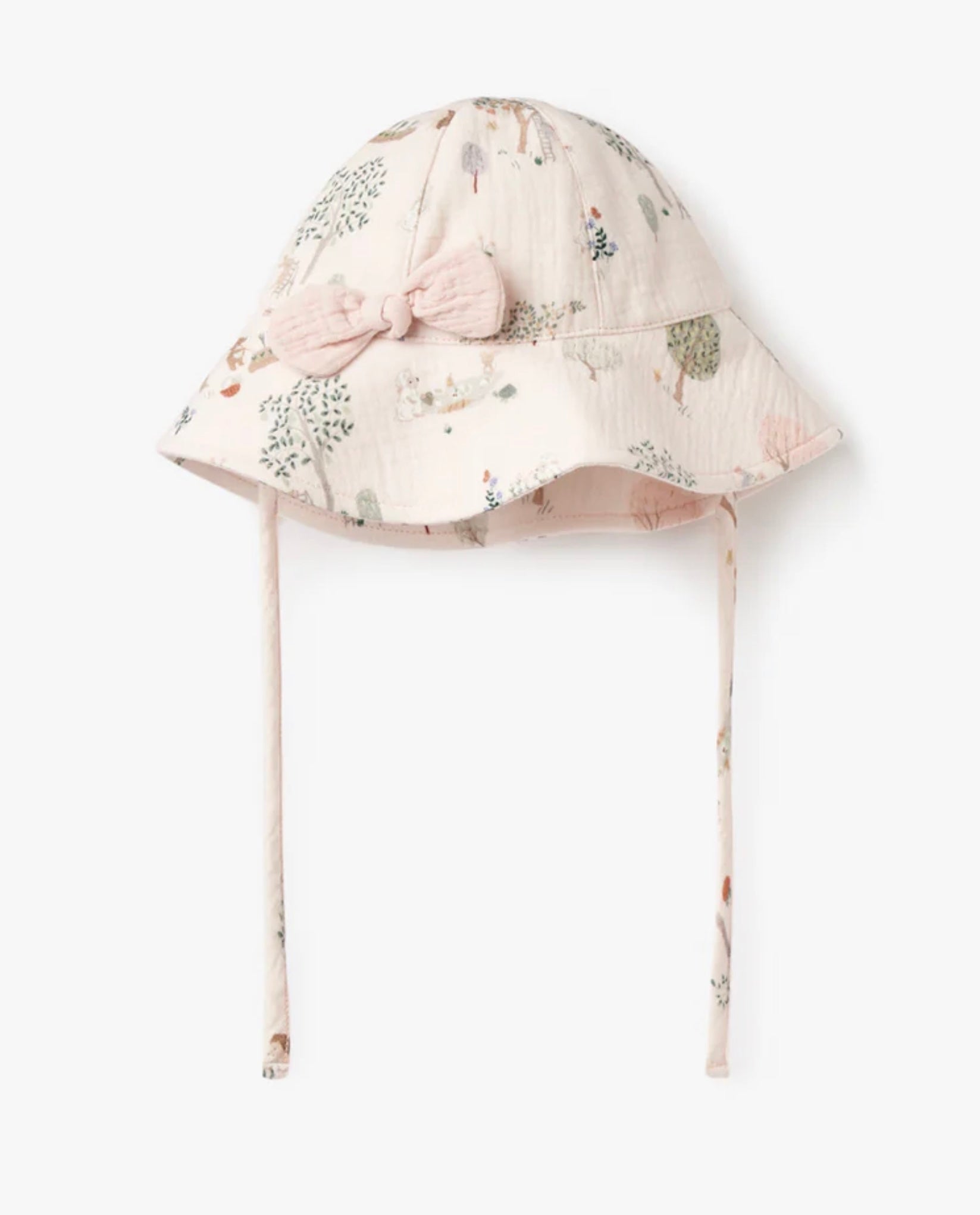 Garden Picnic Bubble is pale pink 100% organic muslin cotton printed with bunnies and bears enjoying a picnic under lovely shade trees. Soft, breathable and easy care bubble has flutter sleeves with pompom trim, two buttons in the back and snap crotch for easy changes. Don't forget the matching hat! Made by Elegant Baby.