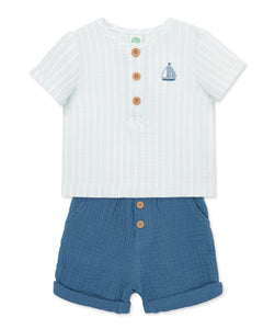 Sail away in style with our Gauze Sailboat Short Set! This two-piece set features a cool gauze fabric that'll keep you feeling breezy and refreshed. The button-front top is adorned with an embroidered sailboat and trendy sleeve cuts, while the pull-on shorts in denim blue offer both comfort and convenience with pockets and faux fly. A must-have for any 'cool' adventure!